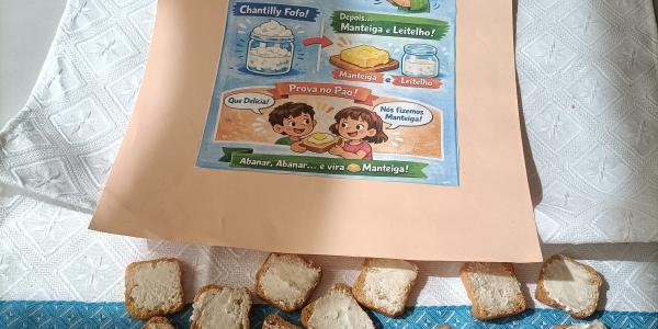 Primeiro, o ar entrou nas natas, tornando-as leves e fofinhas. Era o chantilly a formar-se! Mas a experiência não ficou por aqui. Com mais agitação, os “casacos” das bolinhas romperam-se e a gordura começou a unir-se, formando um sólido - a manteiga.