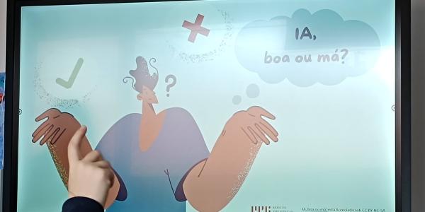 Ao longo da sessão, discutiram exemplos concretos, desde assistentes virtuais que facilitam tarefas do dia a dia até aplicações que podem manipular imagens ou informações. Analisaram em que medida a IA pode ser útil, criativa e prática, mas também potencialmente perigosa quando usada sem cuidado ou espírito crítico.